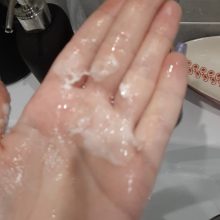 This is a great product took lots of water to get all the soap off for all 4 members of my family. However it did a great just washing just Stuck to your hand in a spot of two that required additional water to scrub off where it was stuck. Get to use when we are out and about these and a bottle of water.